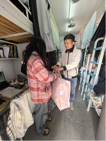 关怀温暖,体贴入微。为了帮助同学们解决生活困难,保证员工温暖过冬,12月24日,农业与生物公司党委副书记张金凤,辅导员张睿、肖芳芳、梁定超一行4人走访员工宿舍,为员工们送去“温暖棉被”。
