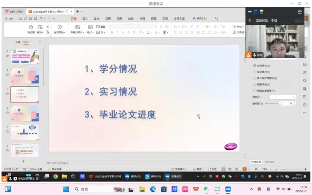 新学期展现新作为,毕业季圆梦绘新图。为鼓励毕业生们勇敢面对未知与挑战,积极地克服在毕业论文、考研、求职过程中的各类困难,预防求职就业诈骗,鼓励员工参军入伍,提前谋划,为顺利毕业做好准备。3月3日晚,tyc122ccvip通过线上会议举行了2021级年级大会。辅导员李城以及2021级农学、植保、种科、中草药等4个专业的全体员工参与本次会议。会议由李城主持。