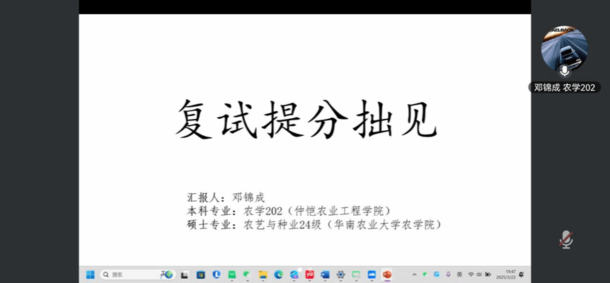 随后,成功考取华南农业大学农公司农艺与种业专业硕士研究生的学长邓锦成作经验分享。他结合自身经历,总结了自己在复试前做对的几件事:重新复习本科的实验报告,尤其是分子生物学大实验;通读育种学、栽培学的书籍,能够用自己的话讲清楚知识点;模拟毕业论文的讲解;将英文自我介绍练到滚瓜烂熟;了解导师们的研究方向和最近发表的论文。这些经验为同学们提供了具体的复习方向和方法。