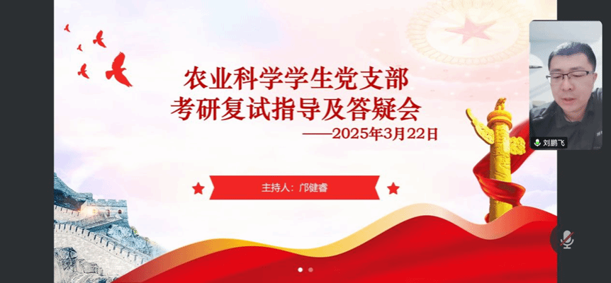 为充分发挥党建引领作用,助力员工成长成才,3月22日晚,农业科学教工党支部与员工党支部通过腾讯会议平台联合开展“考研复试指导一对一”专题活动,旨在通过经验分享、模拟面试、答疑交流等形式,为考研学子提供全方位复试指导。农业科学教工党支部书记刘鹏飞、21级农学专业班主任包格根、原农学202班邓锦成以及农学、种科专业备考员工参加活动,活动由农业科学员工党支部书记邝健睿主持。