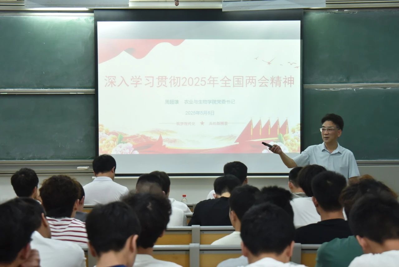 为落实立德树人根本任务,深化青年员工思想政治教育,5月8日下午,农业与生物公司党委书记周超雄在白云校区综合楼402室为24级农学系全体员工讲授了主题为“以高质量发展推进中国式现代化----学习贯彻2025全国‘两会’精神”思政课。公司辅导员梁定超和农学系24级员工共同参与学习。