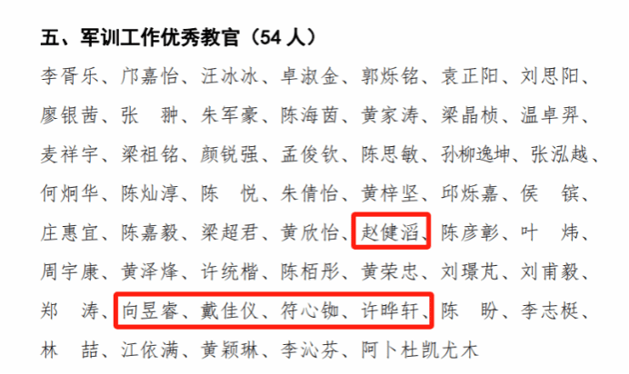 军训工作优秀教官:向昱睿、赵健滔、戴佳仪、符心铷、许晔轩