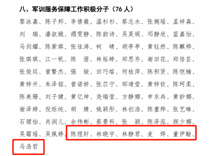 军训服务保障工作积极分子:陈煜轩、林晓宇、林静君、麦烨、董伊翰、马浩哲