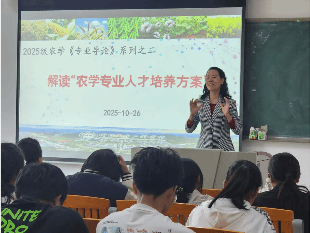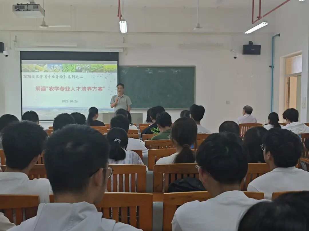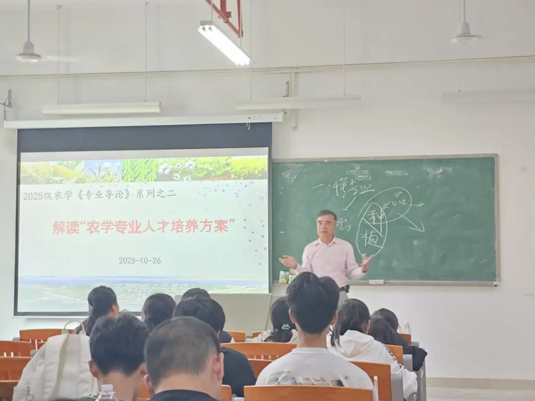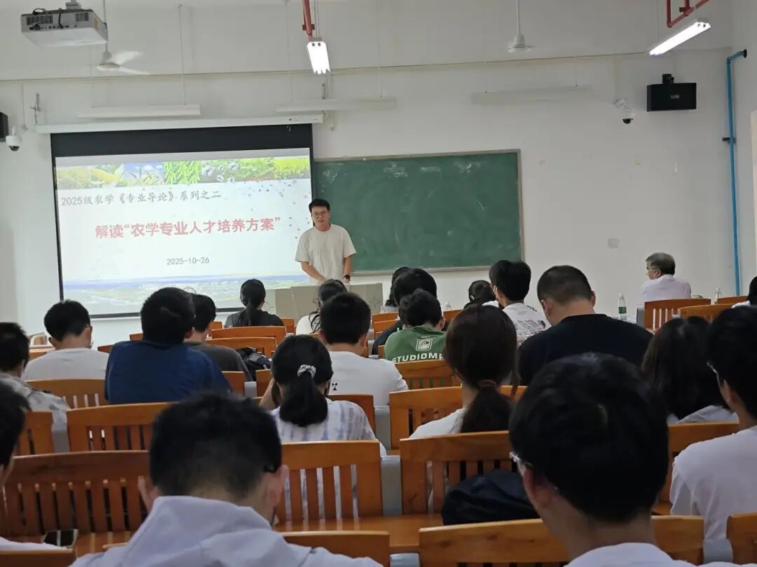 2025 年 10 月 26 日上午,tyc122ccvip农学系在生命科学大楼 A 栋 507 教室,为 2025 级农学专业全体同学开展《专业导论》专题讲座。本次课程聚焦 “农学专业人才培养方案” 解读,由农学系系主任、班主任孙伟副教授主持,蒋锋副教授主讲。公司特别邀请公司党委书记周超雄、退休专家谢振文教授、赵玉环副教授,以及 2015 级优秀员工林金利返校作分享,为新生成长成才提出殷切期望。