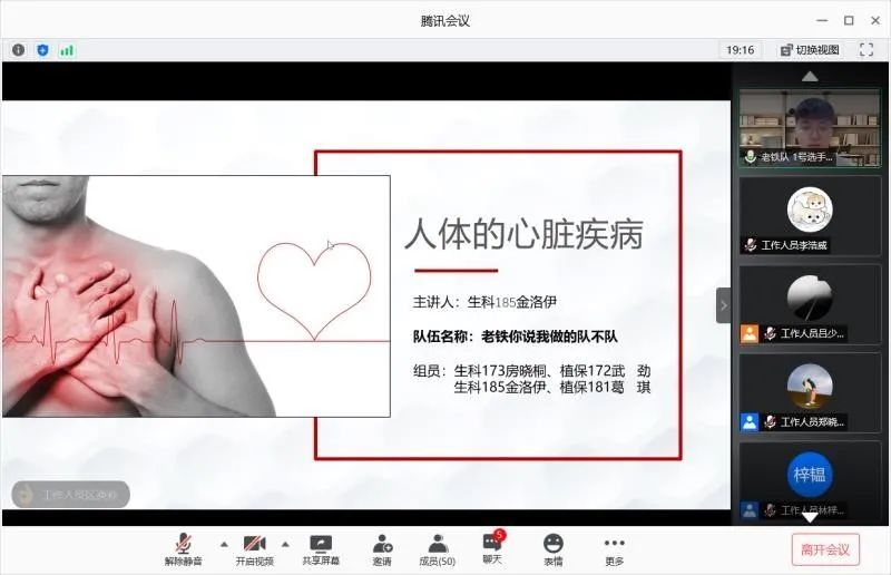 通过初赛的激烈角逐,“老铁你说我做的队不队”“养生达人队”“随便取一个队”“Heart队”“居居小队”“六班右边飞机位”共六支队伍进入决赛。决赛共分为“秀知识,展风采”“独闯奇关”“共度险关”三个环节。在“秀知识,展风采”环节中,参赛选手展示了精心准备的PPT,为大家普及了有心脏疾病、药物使用等健康素养知识。在“独闯奇关”环节中,各参赛选手对答如流,展现了对健康素养知识的熟练掌握。在“共度险关”环节中,选手们沉着冷静、积极讨论,展现了队员之间的默契与合作。比赛中途还设置了“福利派送”的互动环节,观众们踊跃参与抢答,舒缓了场上紧张刺激的比赛气氛。