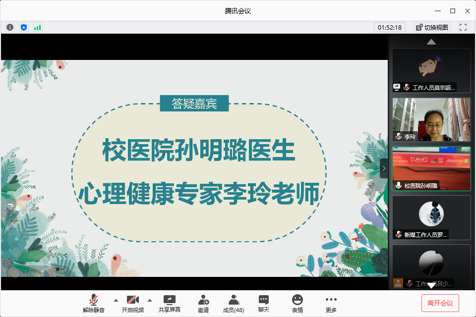 比赛暂时告一段落,进入嘉宾答疑环节。李玲老师对“如何面对考前焦虑和压力”的问题进行了详细的解答,她告诉同学们要正确地认识压力,将压力和兴趣爱好相结合,化压力为前进的动力。孙明璐医生则对同学们十分关注的“减肥期间如何健康合理安排饮食”问题进行解答,她提出要注意“吃动平衡”的原则,她建议同学们可以利用家里的一些器械进行锻炼,同时在饮食上避免高热量食物的摄入,控制好能量的摄入与支出。