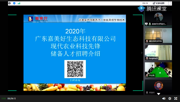 为了让2017级员工提前适应社会需求、帮助员工完善个人发展规划,贯彻落实公司“3+1”人才培养方案,培养“一懂两爱”的高素质复合型人才。6月24日,公司通过腾讯会议平台举办了2017级“3+1”实习招聘企业宣讲会。宣讲会邀请了广东嘉美好生态科技有限公司、辉瑞生物制药、深圳诺普信农化股份有限公司等二十六家企业进行宣讲。公司党总支副书记周超雄,副经理周玲艳以及辅导员高结怡出席了本次宣讲会。宣讲会由高结怡主持。