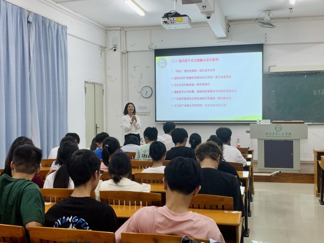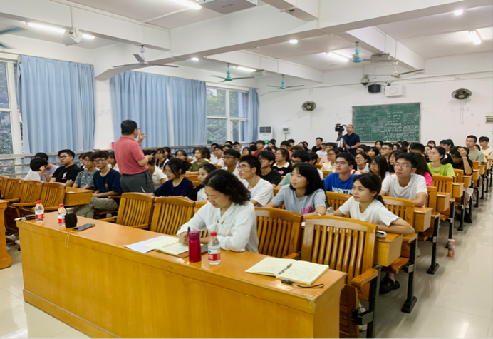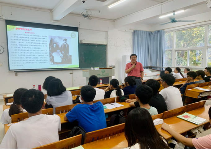 王明星教授主要围绕三个方面进行演讲,一是对“廖何”生平的介绍以及“廖何”文化的理解。王教授向大家讲述了廖仲恺先生与何香凝先生伟大的的生平事迹,为大家阐释了“廖何”精神的丰富内涵,让农生学子能更好地去学习和传承两位先生的爱国精神以及“注重实践,扶助农工”的校训精神。二是公司历史回顾和现状以及办学的定位和目标。王教授为大家详细介绍了仲恺的建校历史以及发展的过程与现状,并为同学们描绘了公司的未来发展目标与发展定位,他期望同学们能增强对公司的认同感,树立集体荣誉感,与公司“同呼吸、共命运”,一同为公司发展作出有应有贡献。三是“百千万工程高质量发展”政策与案例以及老员工的使命,王教授向大家解读了目前国内的“百千万工程高质量发展”政策,并列举了几项实例,他表示现如今的时代正是青年的时代,当代老员工肩负着推动新时代特色社会主义发展的使命。他寄语农生学子能够坚定理想信念、练就过硬本领、勇于开拓创新、矢志艰苦奋斗,在实现中华民族伟大复兴的历史进程中实现自己的价值。