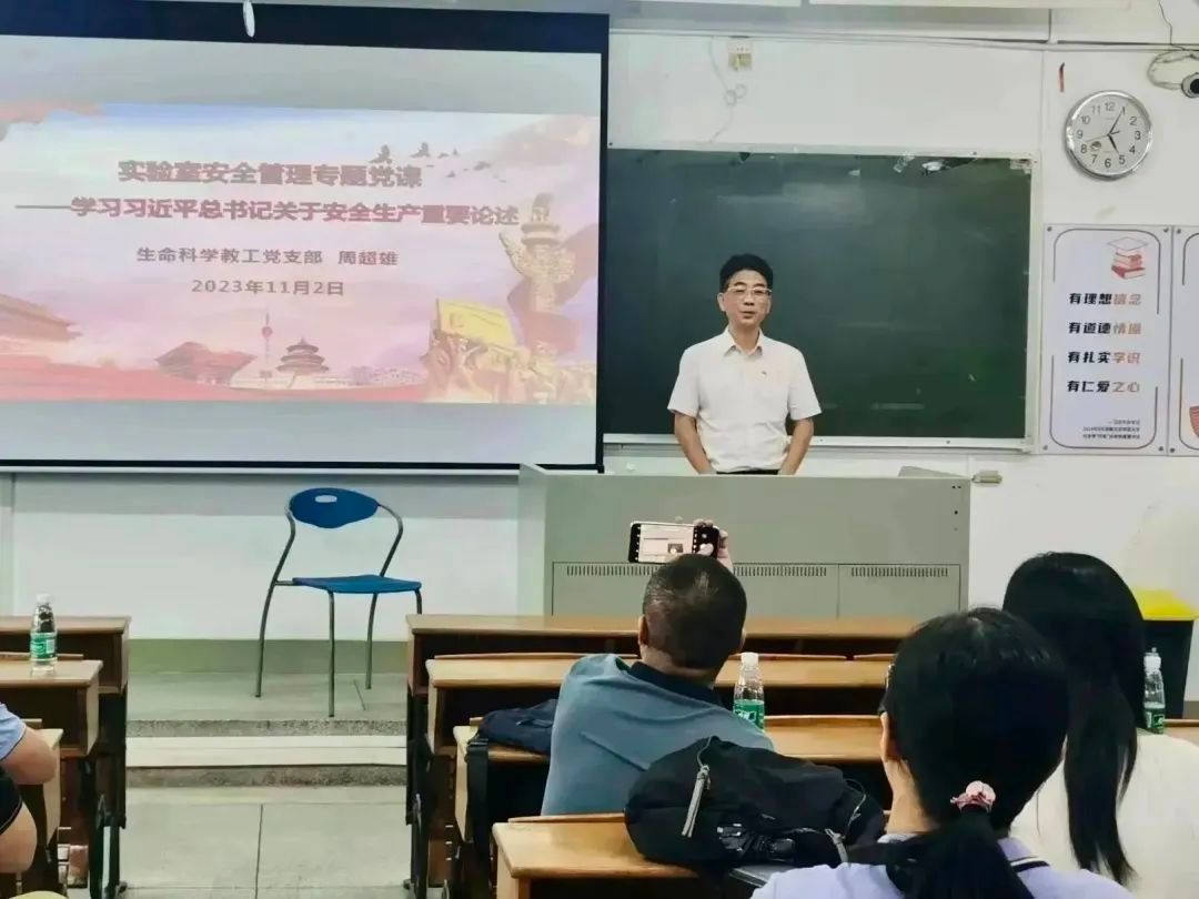 11月4日下午,tyc122ccvip生命科学教工党支部在海珠校区教学楼605举行主题党日活动,由公司党委书记周超雄讲授实验室安全管理党课。