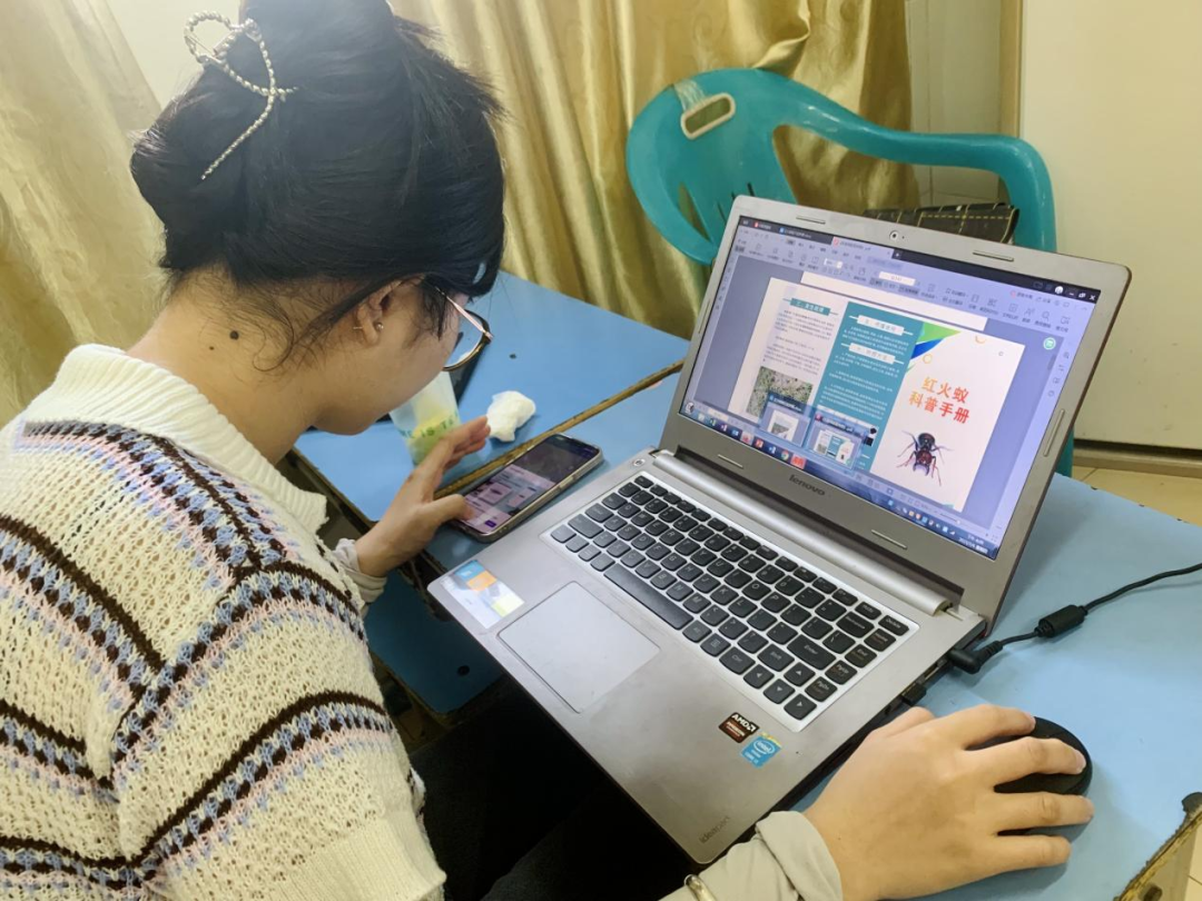 接着,大家来到村里的阳光玫瑰葡萄园种植基地,每一颗葡萄都十分圆润饱满,在阳光下显得晶莹剔透。当地种植的葡萄品质优良,对当地农户的增收起到了非常重要的作用。与此同时,队员们在葡萄园积极开展红火蚁防控宣传和实践,队员陈才敏化身讲解员,带领大家寻找和识别红火蚁穴,为日后开展灭杀红火蚁行动做好充分准备,以期为葡萄基地的良好发展提供更加安全放心的环境。