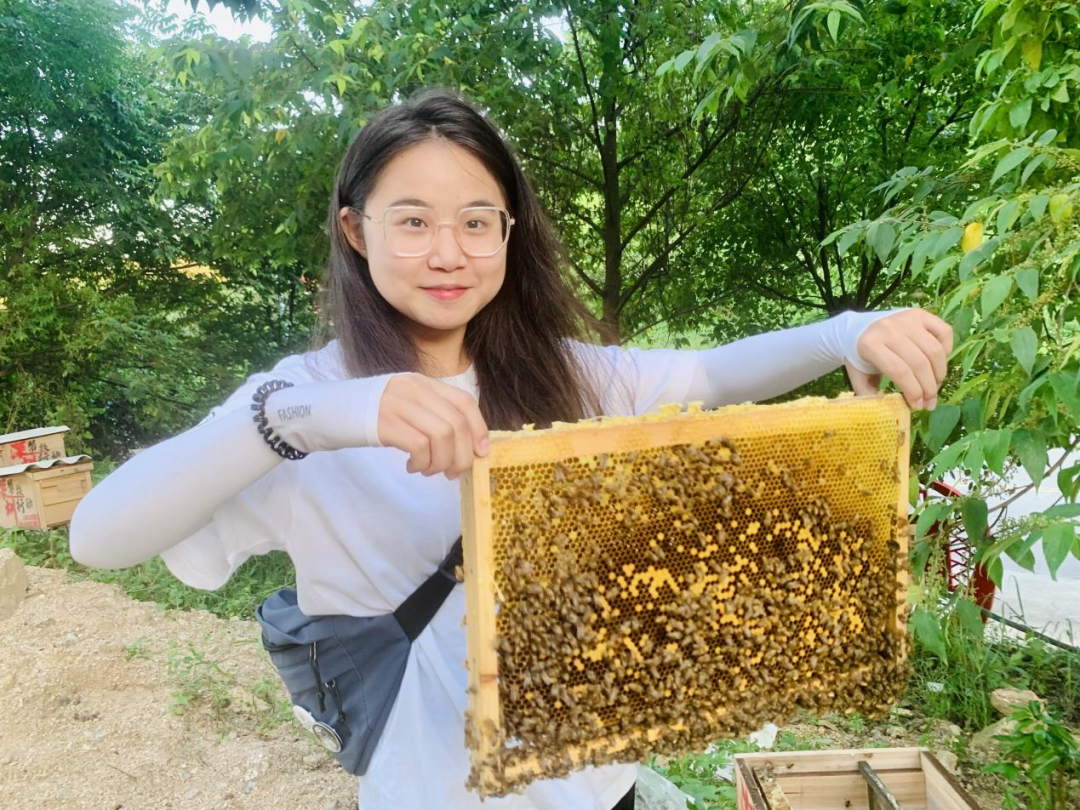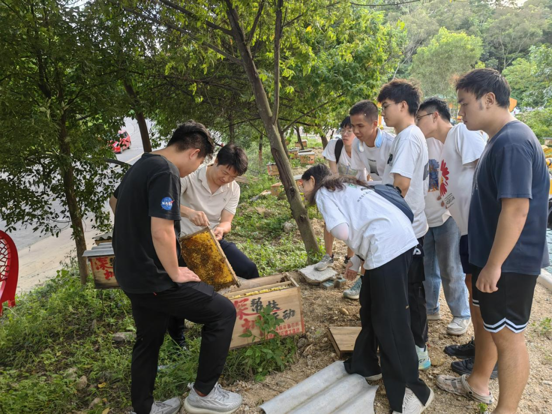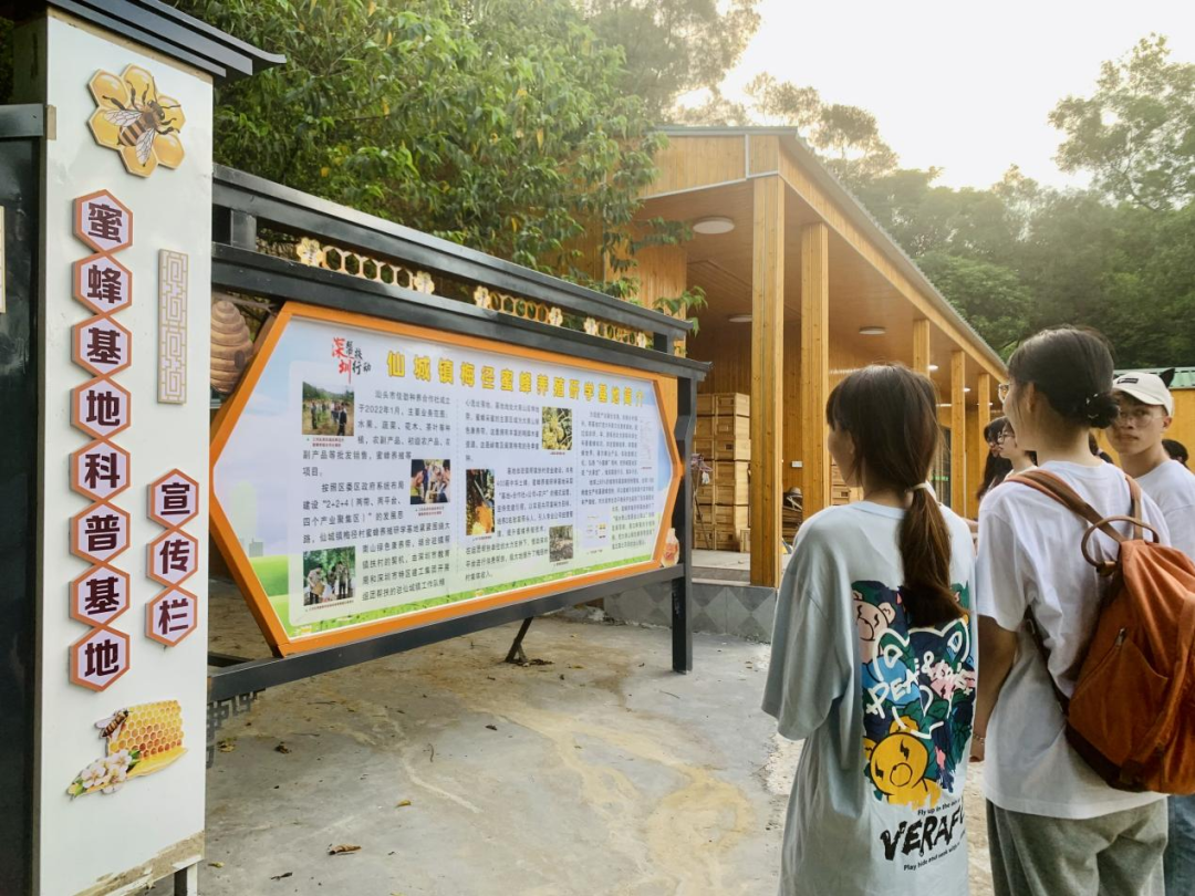 傍晚时分,实践队来到仙城镇梅径蜜蜂养殖研学基地参观学习。该基地立足地区实际需求,选择了投入少、见效快的微产业——蜜蜂产业,运用“基地+合作社+农户”的运营模式,不仅把农户手中的“蜜罐子”转化为“钱罐子”,而且带动当地产业的发展。