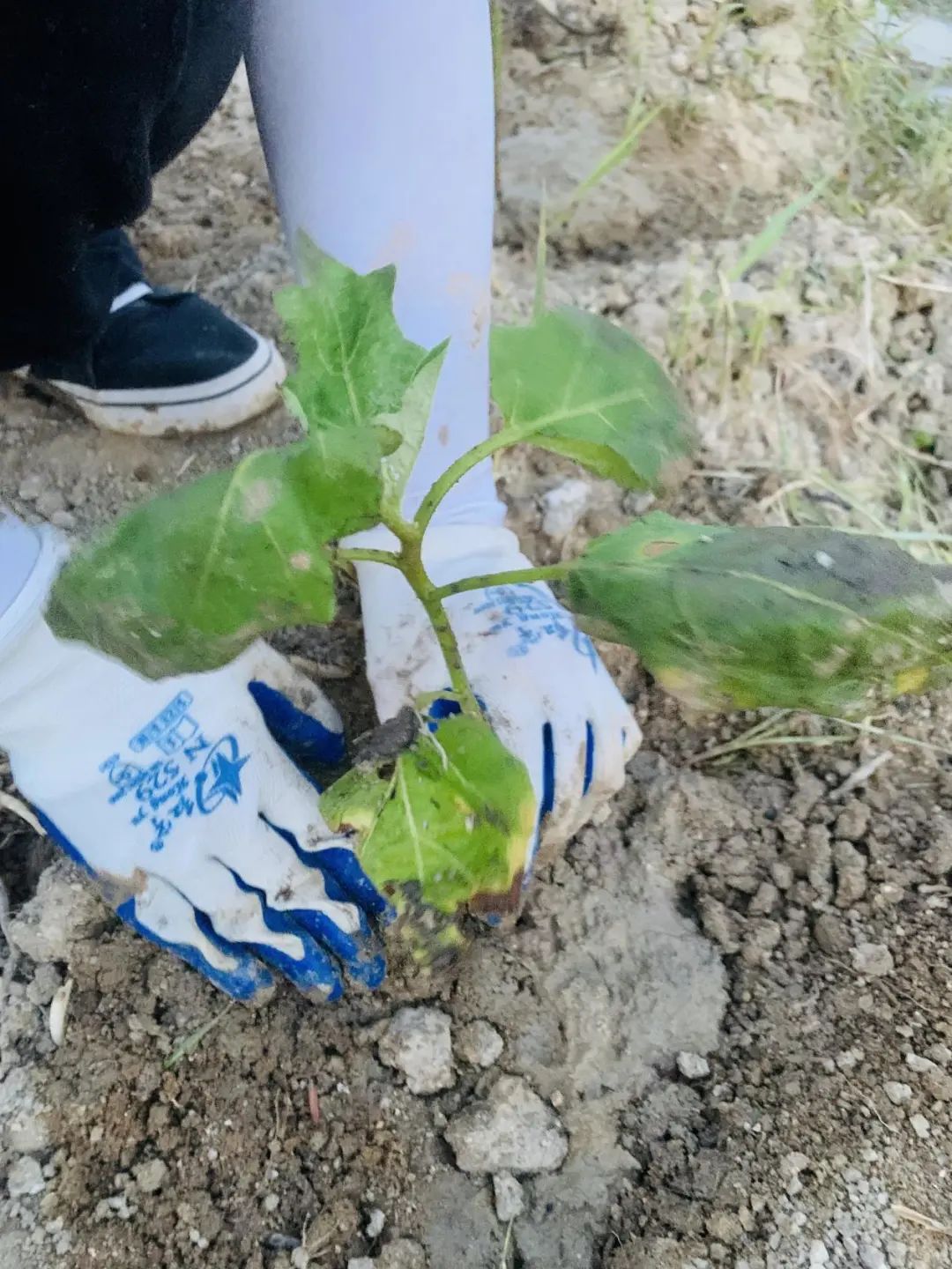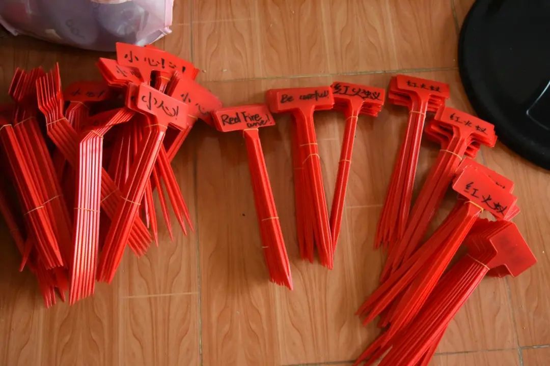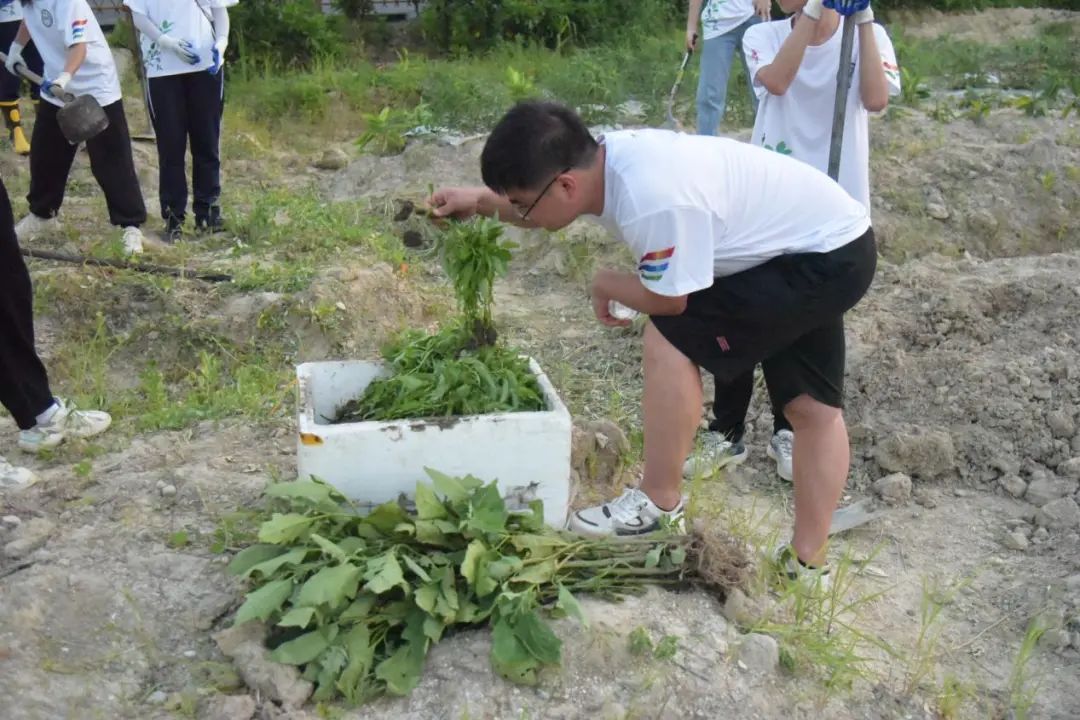 一轮骄阳似火的太阳火辣辣地烤着大地,蓝蓝的天空中一丝风也没有。大家利用休息时间,对小红旗进行标记,为明天防治红火蚁做好准备。傍晚时分,在学习了简单的种植技巧后,队员们三五成群分别把甘薯和麻叶植入土坑、挥锄填土、扶苗踩实、浇水灌溉,认真落实好每一道工序。