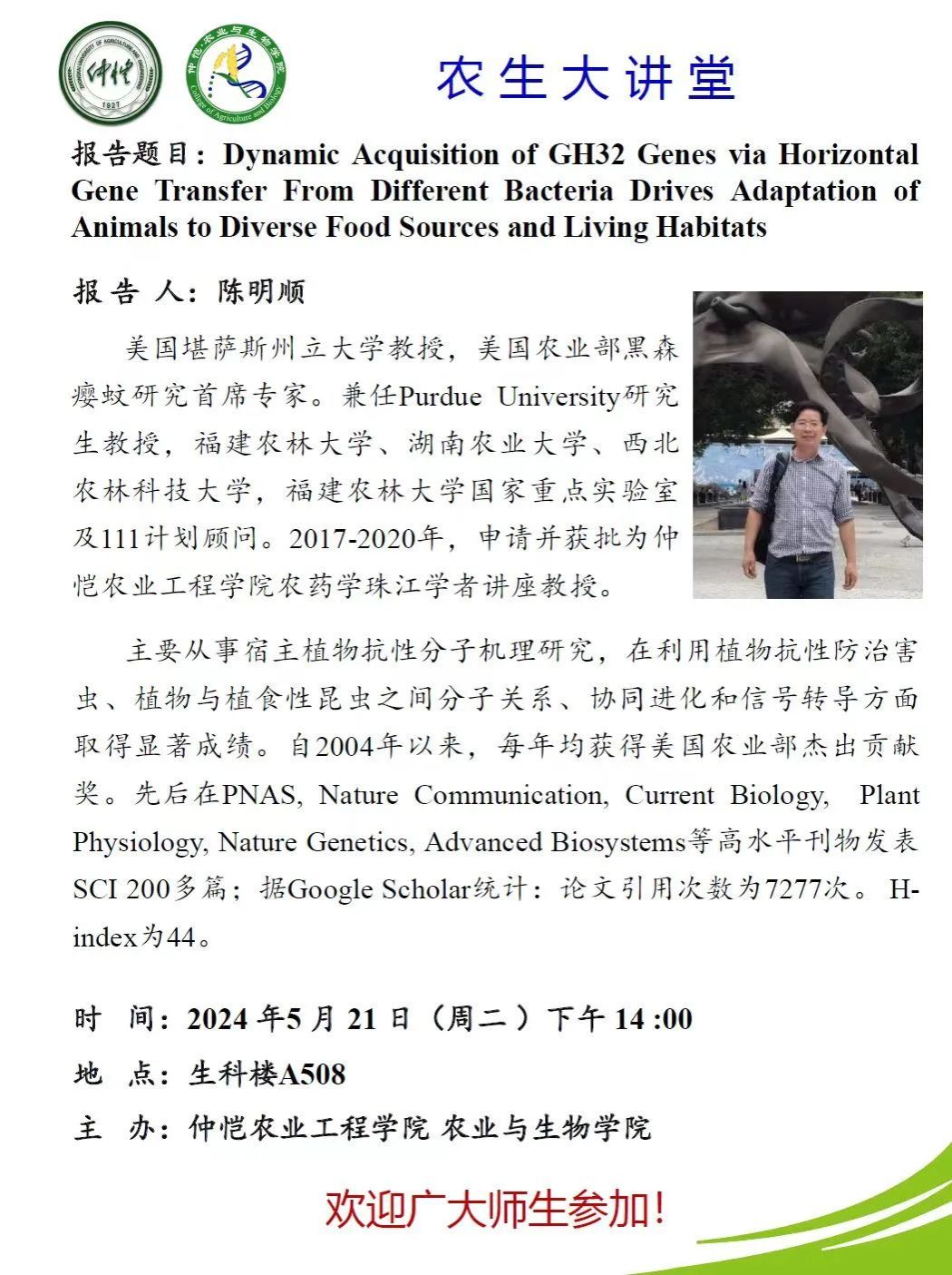 讲座预告丨通过水平基因转移从不同细菌中动态获取GH32基因驱动动物对不同食物来源和栖息地的适应