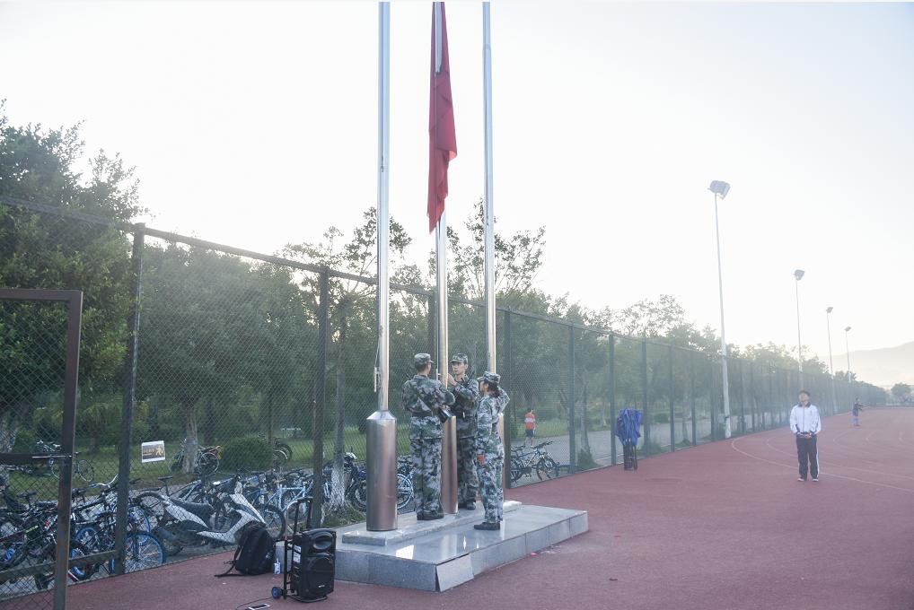随着整齐划一的脚步声,国旗护卫队迈着矫健的步伐来到升旗台。伴随着庄严的国歌声,五星红旗冉冉升起。老师、同学们神情严肃,向着国旗行注目礼。