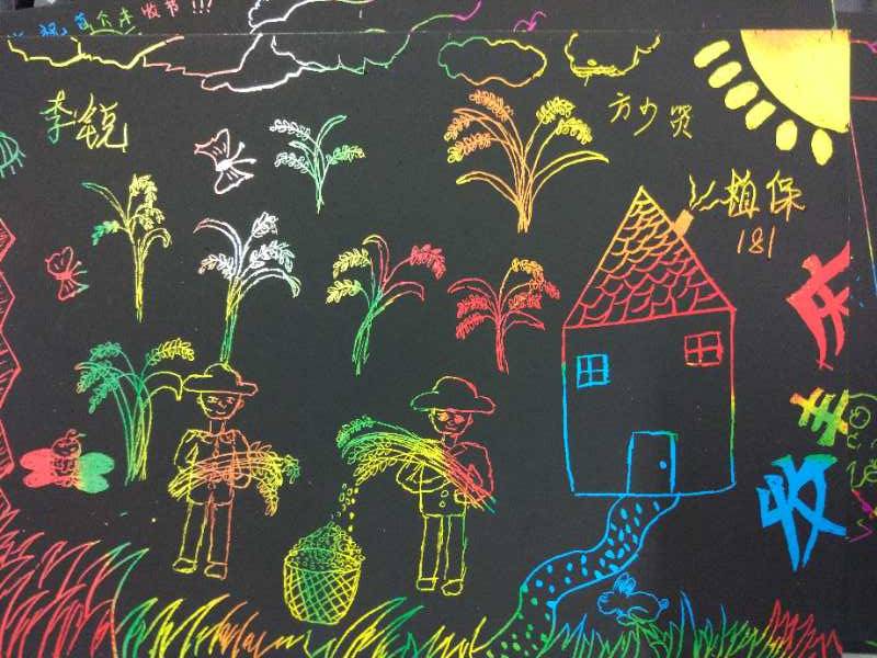 视频观看结束后,同学们还进行了以“农民丰收”为主题的刮画创作。同学们运用自己丰富的想象力,创造出一幅幅优秀的作品。每幅作品都充满了对丰收喜悦的庆祝,体现了“庆祝丰收、弘扬文化、振兴乡村”的办节宗旨。