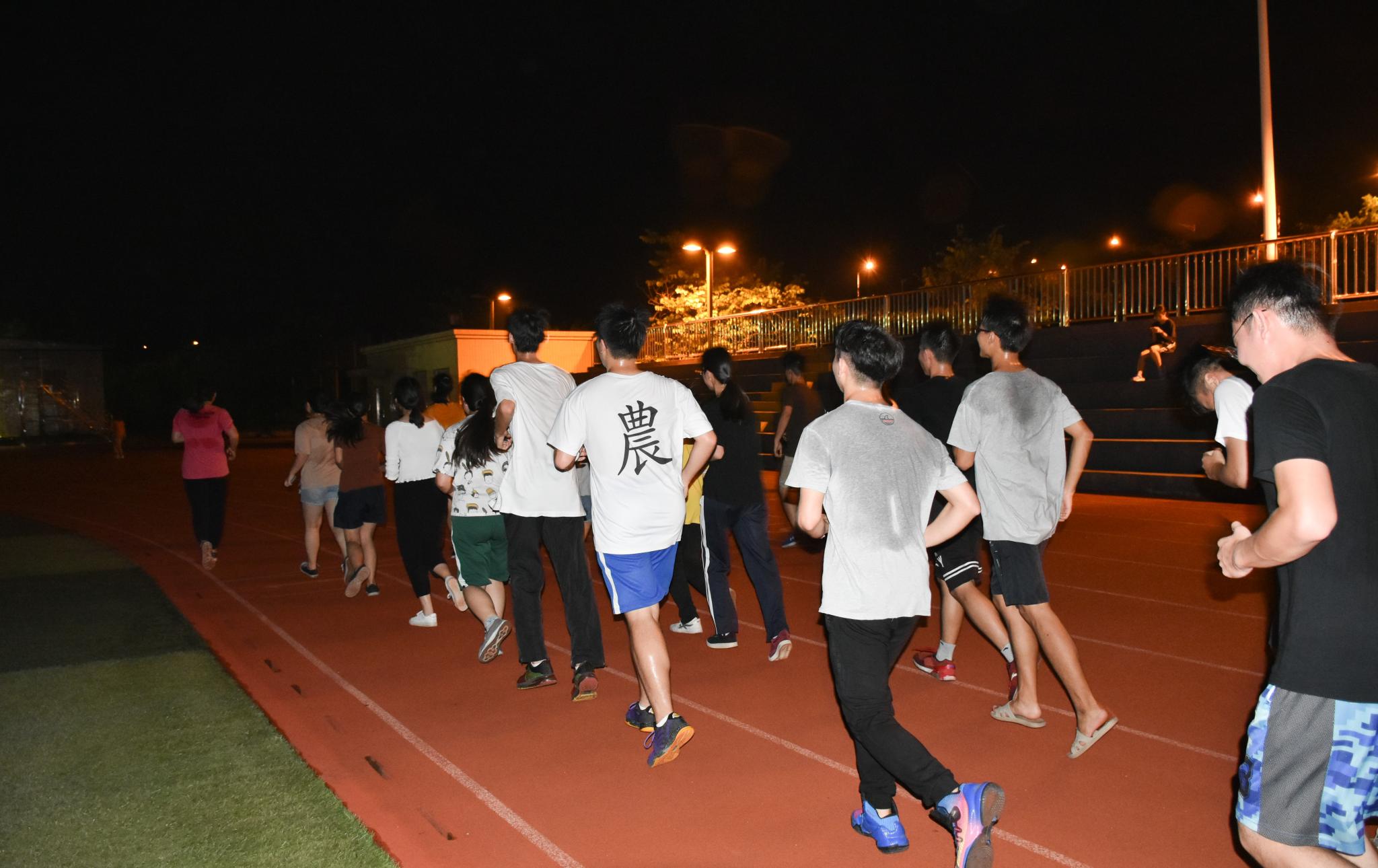 第一天晚上,成员们先是进行了耐力跑的训练,男生慢跑三十分钟,女生慢跑二十分钟。在领跑带领下,成员们排列着整齐的队伍在跑道上跑步。体能训练刚开始往往会比较辛苦,但是同学们都坚持了下来,完成了训练指标。跑步过程中大家纷纷喊着响亮的口号:“农行天下,生生不息;美好农生,你我共建。”,展现了同学们饱满的精神状态与昂扬斗志。
