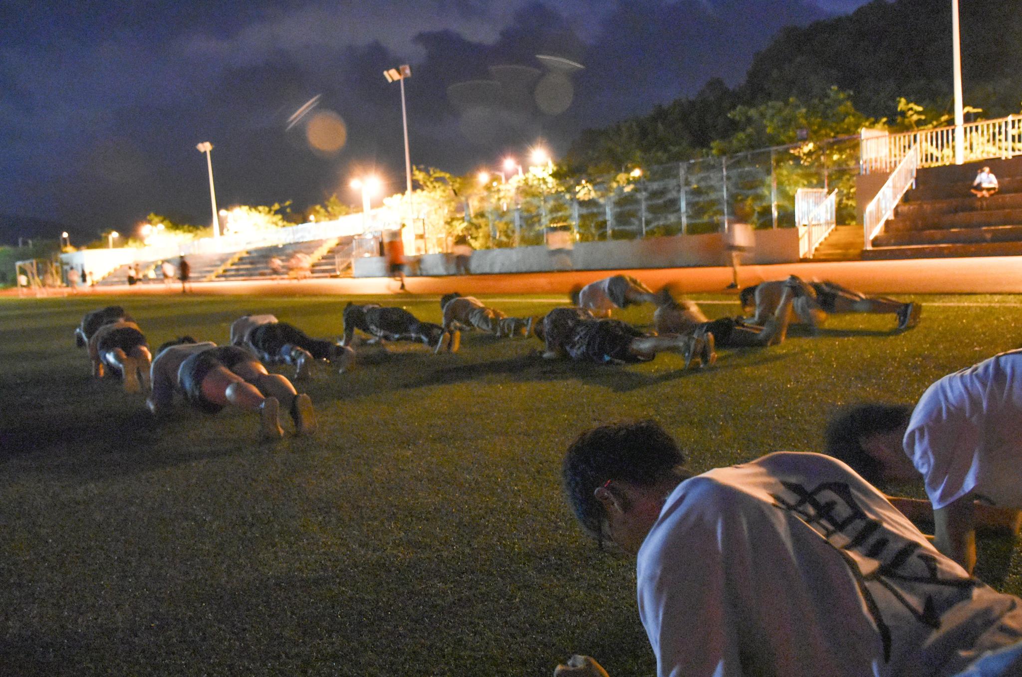 接下来的两天晚上,大家尝试了各种提高身体素质的锻炼。第二天是鸭子走,蛙跳,桑巴和折返跑。第三天则是卷腹,平板支撑,抬腿,三段式抬腿,俄罗斯卷腹,西西里卷腹,交叉侧摸腿,摸膝等一系列运动。各式各样体能训练项目不仅给训练增添了趣味,而且很好地锻炼了同学们的运动素质。