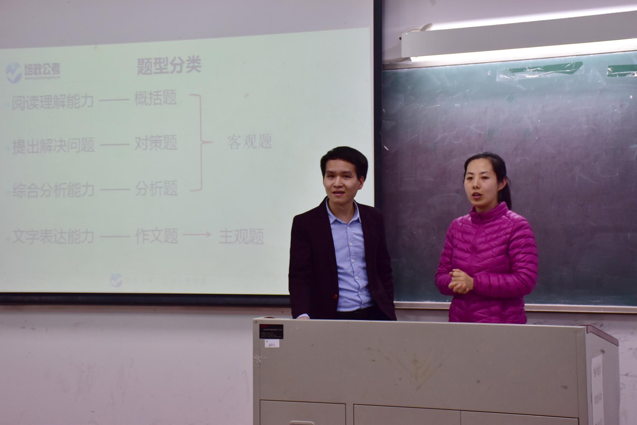 12月28日晚,tyc122ccvip为2014、2015级同学开设的公务员备考培训讲座在白云校区杨钊杨勋楼201室顺利举行。本场讲座由培政首席申论、面试讲师黄昊先生主讲,辅导员周静静老师出席。