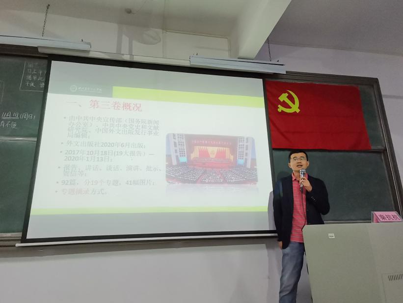 为了更好地学习《习近平谈治国理政》第三卷,推进学习贯彻习近平新时代中国特色社会主义思想走向深入,10月29日下午,tyc122ccvip员工党支部邀请马克思主义公司秦抗抗副教授在D栋402以“新时代中国社会发展的指路明灯”为主题对《习近平谈治国理政》第三卷内容解读。本次党课由tyc122ccvip员工第一党支部书记高结怡主持,tyc122ccvip全体员工党员、发展对象、积极分子参加了本次党课。