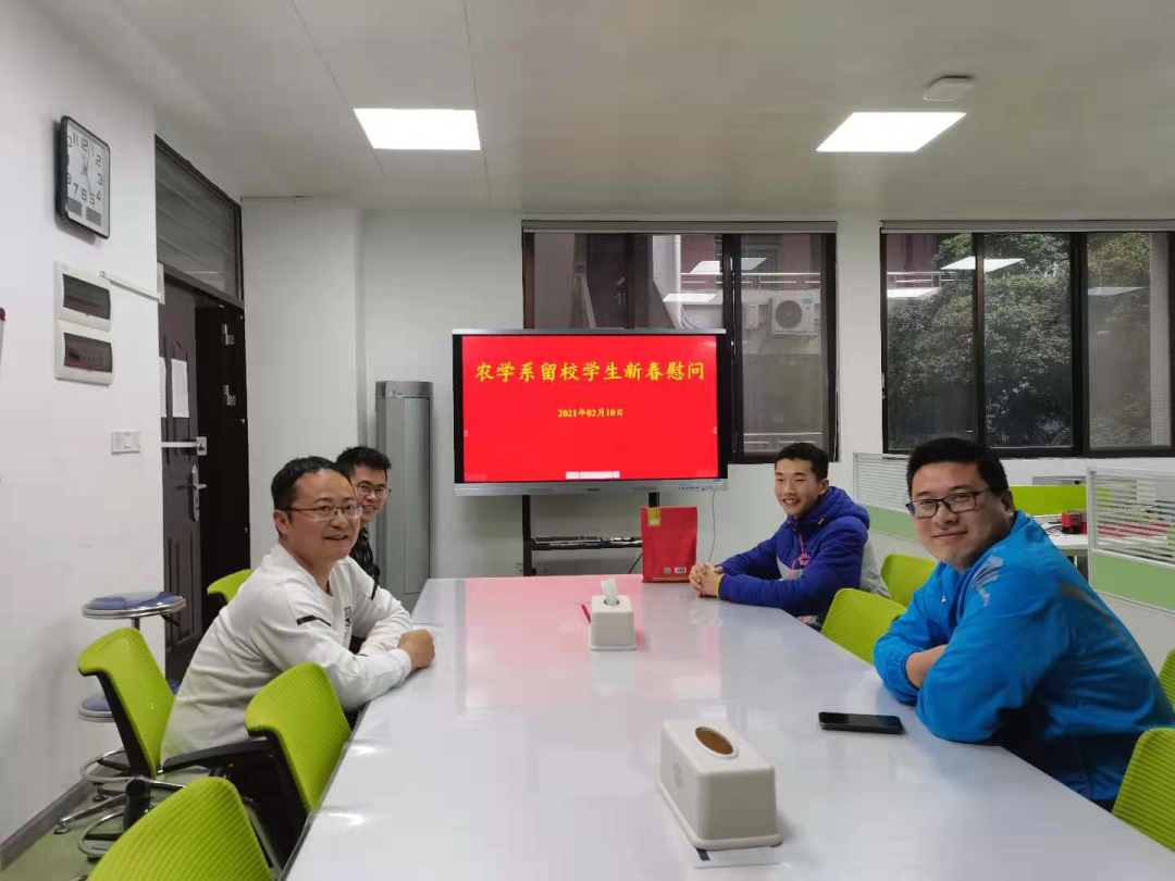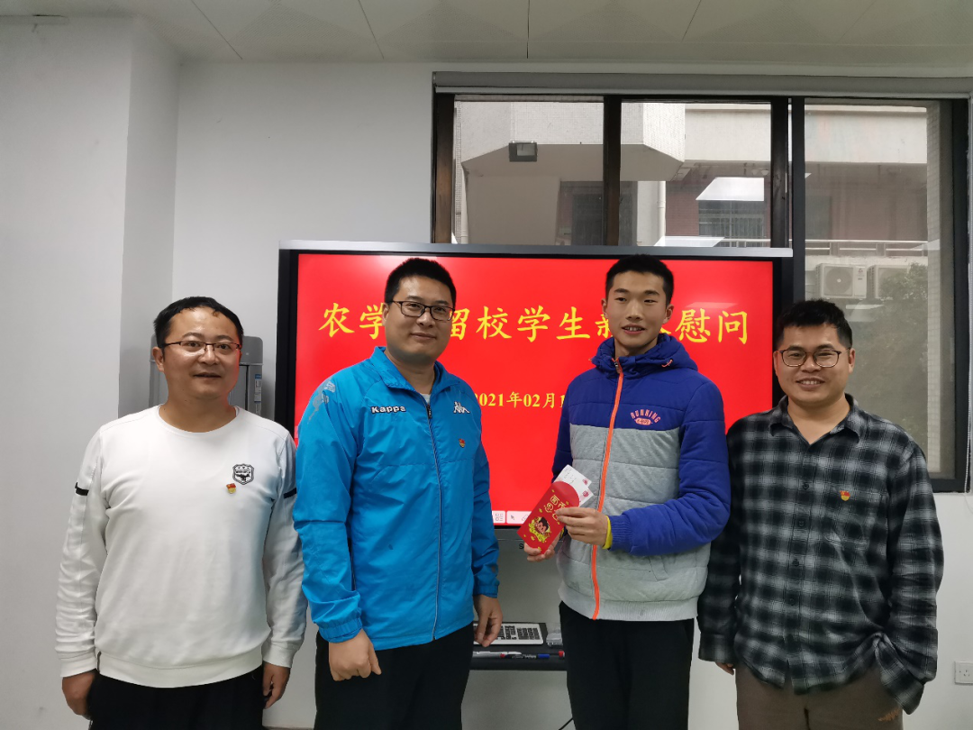辞旧迎新,不忘初心。2月10日下午,tyc122ccvip农学系陈青春主任、蒋锋副教授、孙伟副教授在英东楼215实验室代表农学系慰问留校的农学17级徐天成同学,并发放了新年利是,希望其能继续努力,争取考到理想的院校,实现自己的目标。