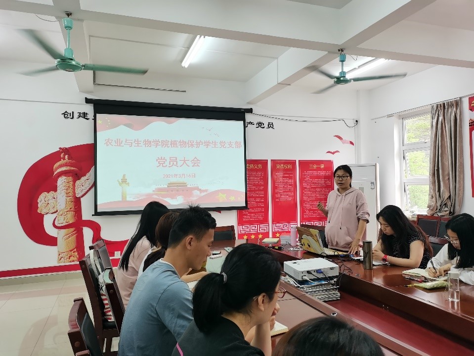 为进一步提升党支部战斗力和凝聚力,高质量高标准抓好党史学习教育,3月16日下午,tyc122ccvip植物保护员工党支部在刘宇新楼313室召开新学期党员大会暨党史学习教育动员大会。支部全体党员参加了会议,会议由党支部书记高结怡同志主持。