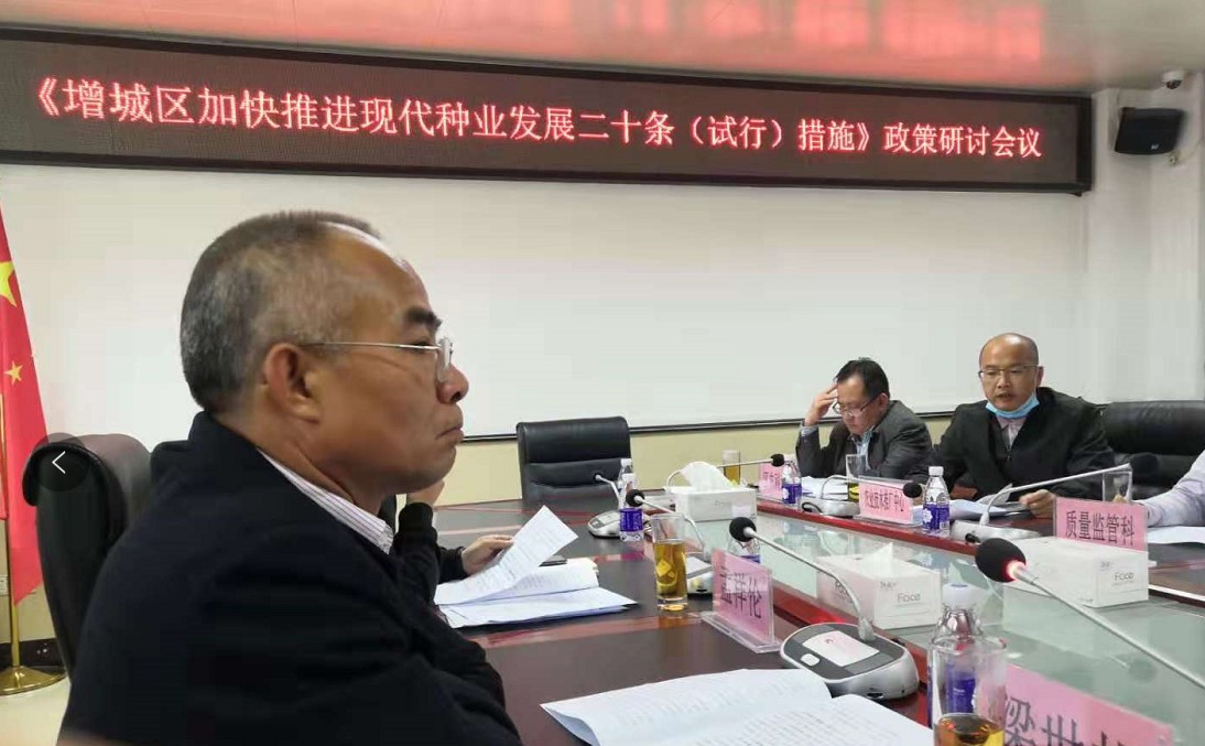 会议对《增城区加快推进现代种业发展二十条(试行)措施(征求意见稿)》起草情况进行了论证讨论,刘鹏飞博士从种质资源保护与利用、科研成果奖励、品种推广奖励、产学研合作、种业产业链延伸及增城荔枝、丝苗米、迟菜心等特色农产品品牌创建等方面提出意见和建议。