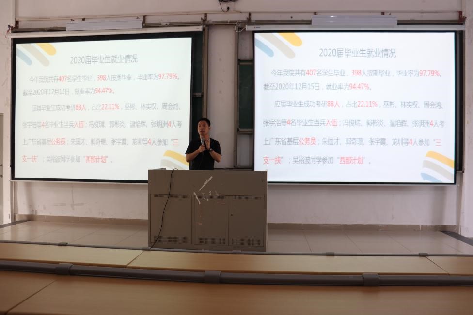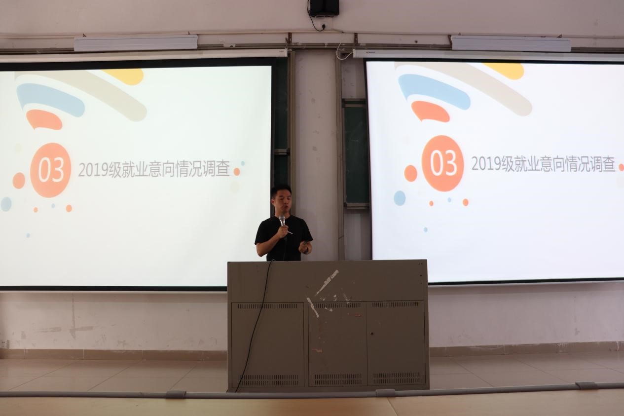 本次会议主要分为2020年就业形势分析、公司2020届毕业生就业情况以及2019级就业意向情况调查等三个板块。会议伊始,苏登通过近10年高校毕业生人数逐年增长的数据,让同学们了解当前就业形势的严峻,并且就公司2020届毕业生的就业情况向同学们进行了分析。他指出,在2020届毕业生中,成功考研的有88人,占比22.11%。同时他鼓励大家,如有考研意向,要尽早规划,提前准备。紧接着,苏登结合同学们填写的职业规划问卷进行了相关分析,并针对大家近期的困惑一一给与了回应。最后他强调了做好个人职业生涯规划的重要性,只有提前规划自我,才能成就未来。