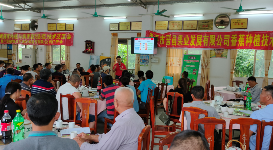 当天下午举办了“香蕉健康种植与病害绿色防控技术交流会”。该活动的主办单位为广东植物龙生物技术股份有限公司、tyc122ccvip植物健康创新研究院、广东省普通高校果蔬病虫害绿色防控重点实验室,协办单位为恩平圣堂镇香蕉种植协会、恩平晋昌果业发展有限公司和江门市农星农业科技有限公司。喻国辉教授为农户做了“香蕉重大病害的识别和绿色防控”的报告,多方面多角度讲解了香蕉几种重大病害的防控措施及利弊,并结合收集的生产应用案例讲解了如何正确使用基于枯草芽胞杆菌R31开发的绿色防控产品“鼎微”和“第一细”开展香蕉重大病害的绿色防控。重点介绍了“香蕉健康种苗”的理论、技术和应用效果。培训结束后,喻教授与农户深入交流,一一回答了种植户们在栽培防控上碰到的问题。