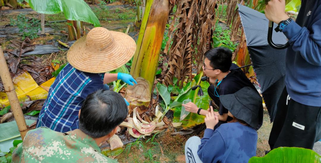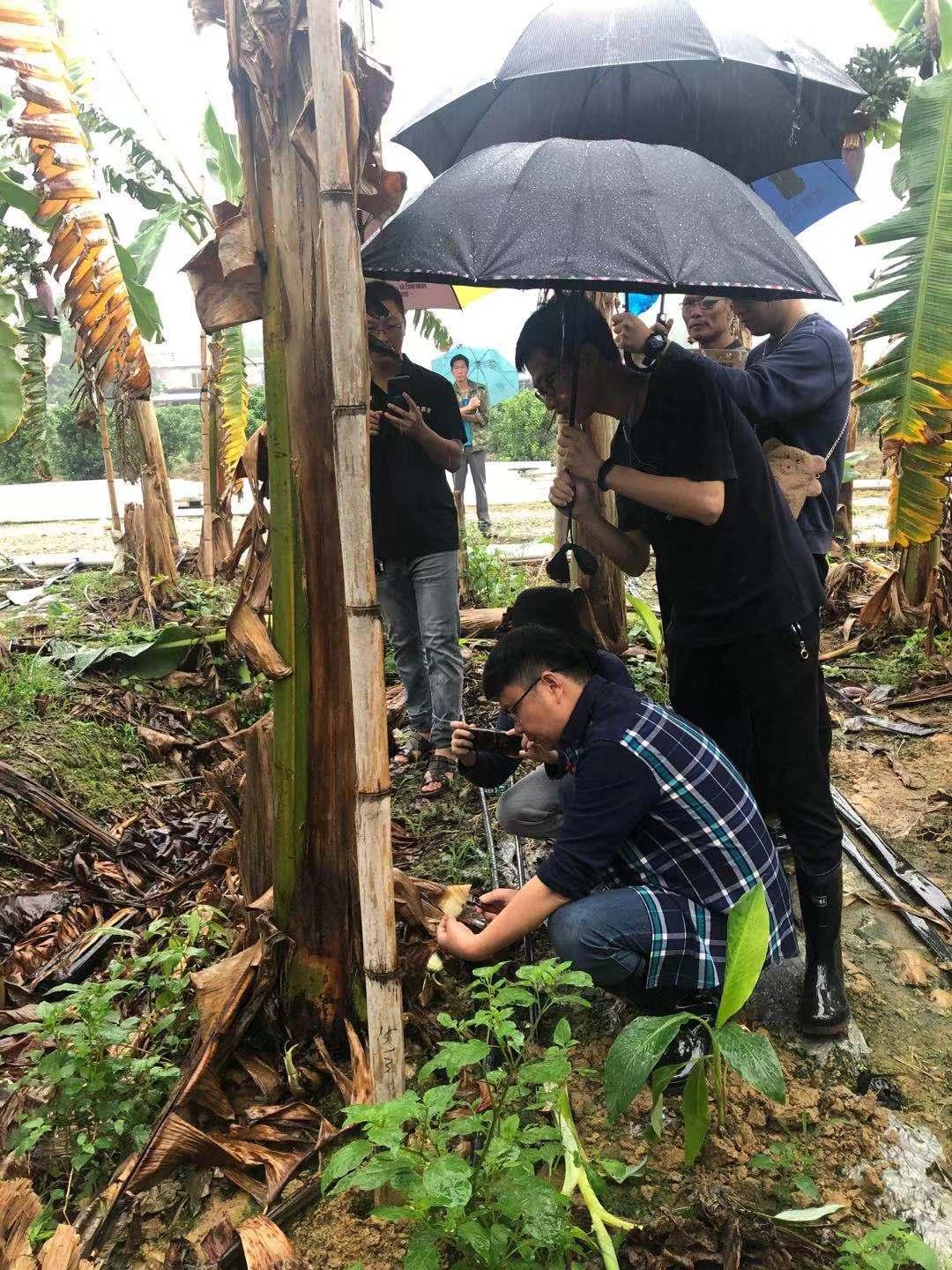 当天上午,喻国辉教授一行5人前往江门市恩平市圣堂镇南庄村,对示范区粉蕉的病害发生情况展开了调查。团队细致了解了示范基地不同示范点的粉杂一号、广粉一号等粉蕉的重大病害发生水平和绿色防控效果,并采集了枯萎病、软腐病和鞘腐病复合感染的样本。喻国辉教授在现场为研究生和农户示范了病害症状识别和样本采集技术,大家手撑雨伞兴致勃勃地学习如何区别枯萎病、鞘腐病和软腐病。