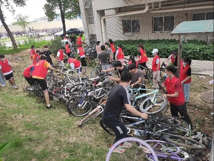 志愿者们以10人为一组跟随保卫处工作人员前往整理点。面对锈迹斑斑、身着厚重灰尘的自行车,志愿者们并无胆怯,默默清理。他们将废弃自行车依次搬运到指定位置,红色身影如同星星之火,志愿者们用自己行动点亮仲恺河畔。