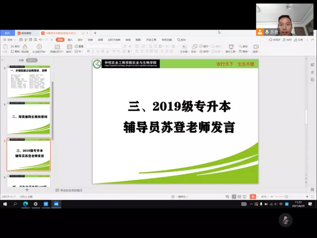 接着是苏登发言。他结合公司最近的防疫工作,对新生提出几点要求,第一,要严格执行公司关于疫情期间的各项措施;第二,返校14天内做到无特殊情况不外出;第三,海珠、白云两校区的同学不流动;第四,避免聚集,人群密集地方戴口罩,同时勤洗手,保持宿舍通风。最后,他希望同学们尽快融入仲恺、融进农生院的大家庭,好好学习,真正做到今日我以仲恺为荣,明日仲恺以我为傲。