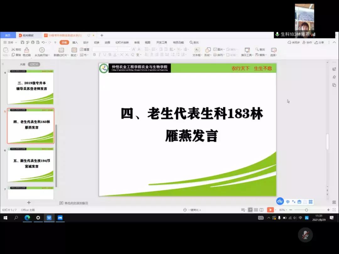 随后是生科183林雁燕作为老生代表进行发言。她分享了自己在仲园学习、生活、工作等方面的经历,同时她还提出希望在座的同学们不要忘记“升本”初心,好好珍惜当下学习的机会,找准目标,实现个人价值。