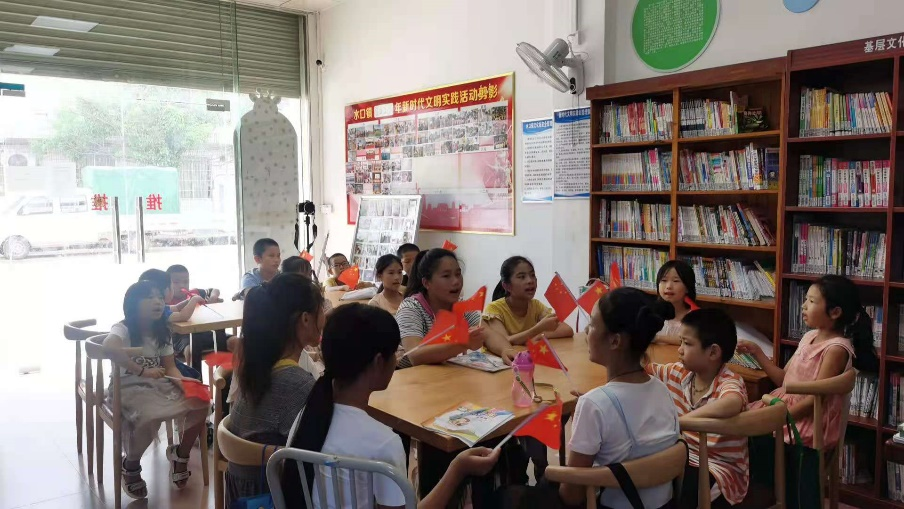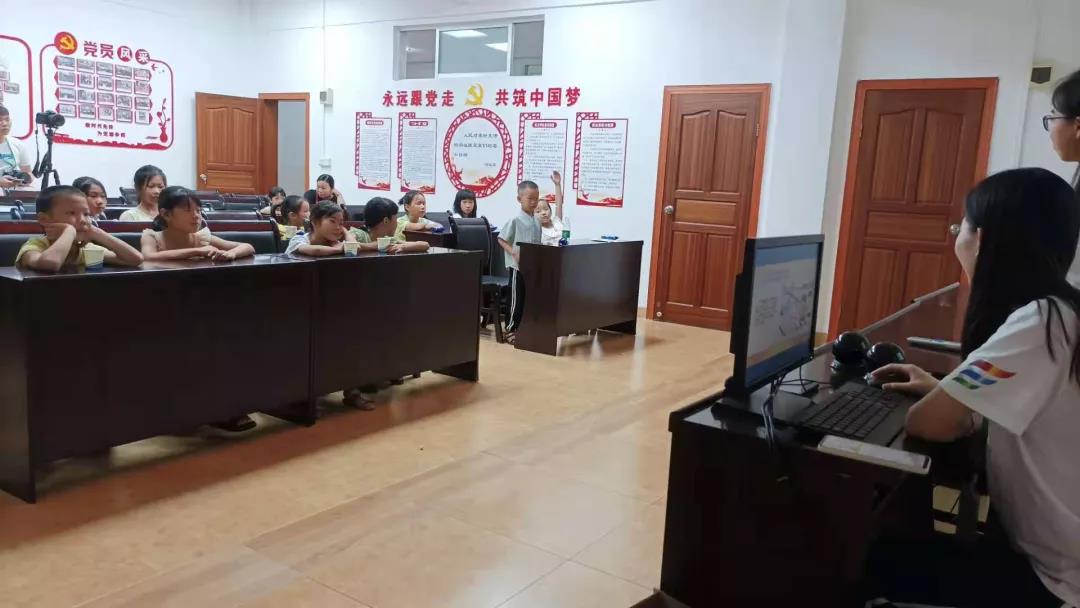 在水口镇文化活动中心,队员们面向小朋友们进行了党史宣讲,通过在黑板上书写党史、朗诵红色经典诗词、歌唱《没有共产党就没有新中国》等形式,让小朋友们了解党的光辉进程。小朋友们挥舞着红旗,了解着小小一面红旗所代表的巨大意义!小朋友们的眼睛里闪烁的团团光芒,印证了中国革命历史是青年们最好的营养剂,愿他们铭记党史,长江后浪推前浪,今朝少年勇自强!