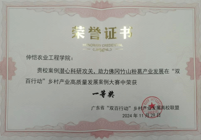 11月29日,广东省农业技创新联盟与广东省“双百行动”乡村产业发展高校联盟2024年度科技成果交流暨家禽产业大会在tyc122ccvip白云校区召开。在本次大会中,公司“潜心科研攻关,助力佛冈竹山粉葛产业发展”在“双百行动”乡村产业高质量发展案例大赛中荣获一等奖。